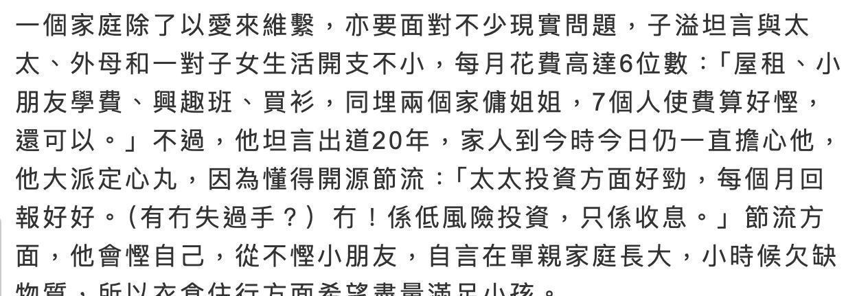 家里七口人要养,每月开支得六位数,房租就占六万,租住在西贡浅水湾的独立屋,毕竟两人名下房产都偏小,住不下一家四口、岳母和两名佣人。孩子的开销也不含糊,名校学费加各类兴趣班,罗子溢自己单亲长大缺过物质,如今对孩子格外大方,自己和妻子反倒处处节俭。